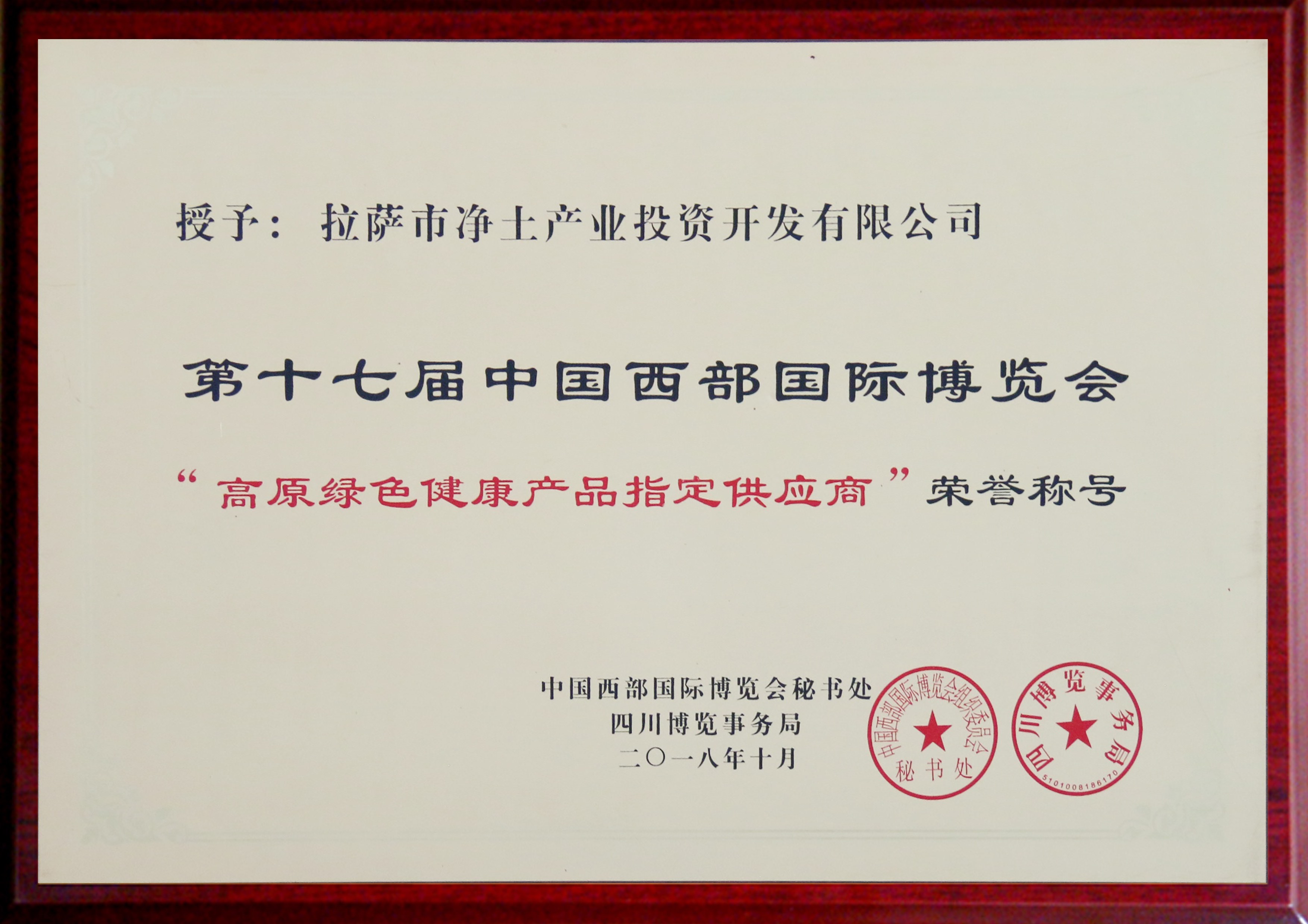 2018年第十七屆中國(guó)西部國(guó)際博覽會(huì)“高原綠色健康產(chǎn)品指定供應(yīng)商”榮譽(yù)稱號(hào)