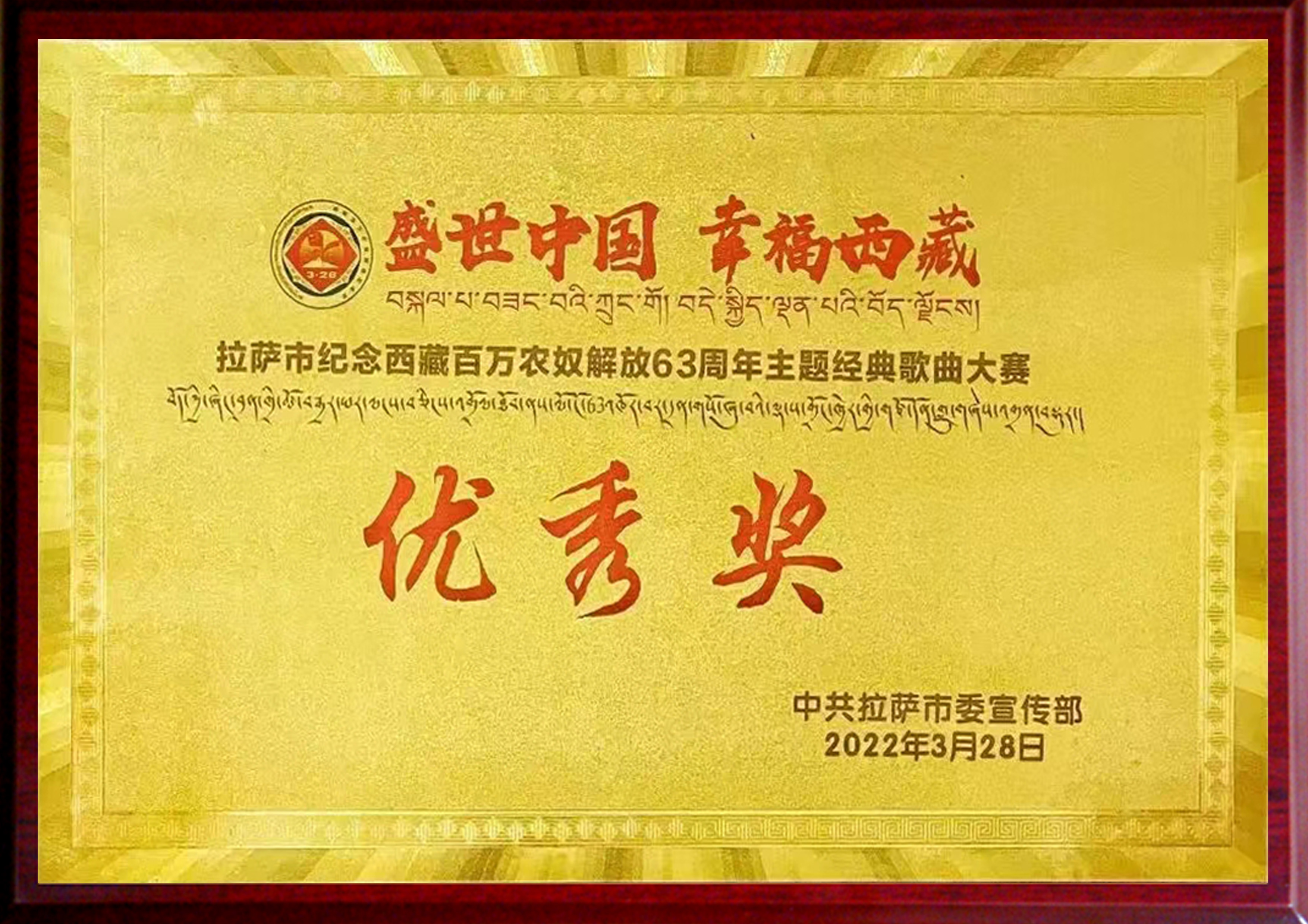 拉薩市紀(jì)念西藏百萬(wàn)農(nóng)奴解放63周年主題經(jīng)典歌曲大賽“優(yōu)秀獎(jiǎng)”