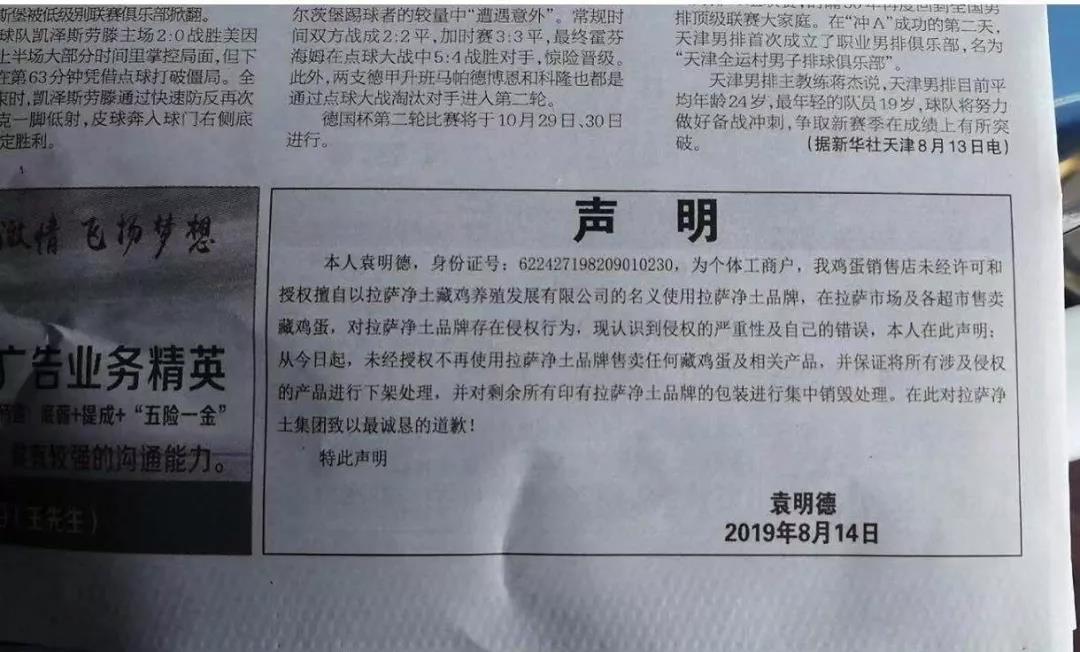 2019年8月1日至8月2日,個體戶袁明德已將所有侵權(quán)產(chǎn)品全面下架;8月4日,侵權(quán)外包裝在凈土藏雞公司監(jiān)督下集中銷毀,并就侵權(quán)賠償金事宜達成具體賠付協(xié)議,其銷售渠道及平臺正陸續(xù)接收中。8月14日在拉薩晚報上進行登報道歉。